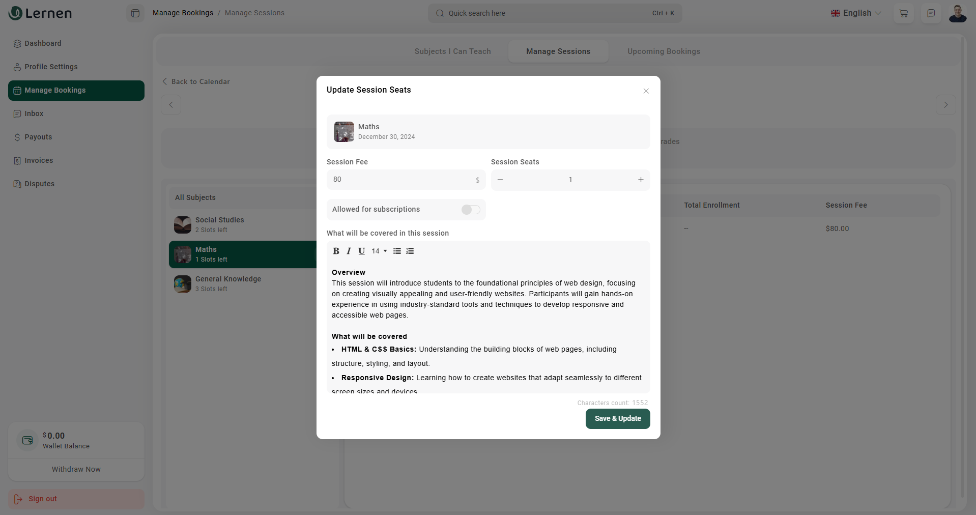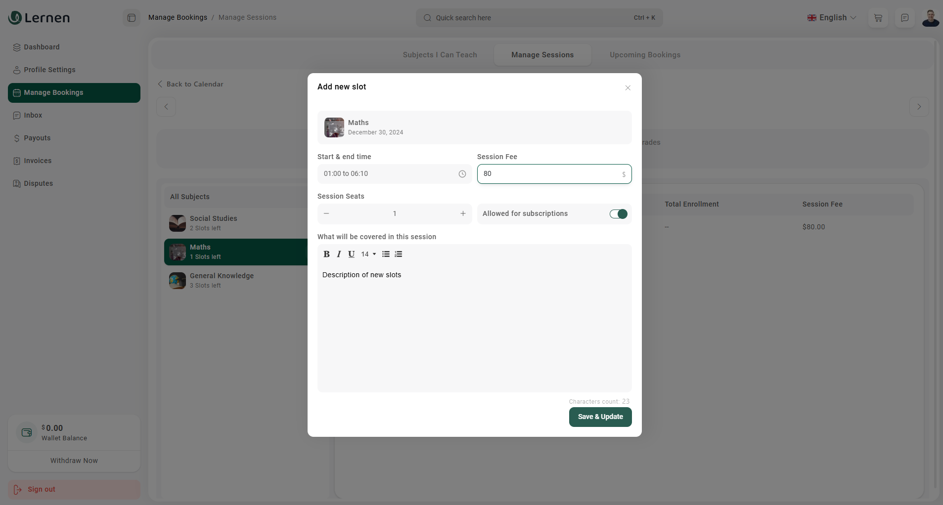 The Edit Session feature allows tutors to modify existing time slots for their teaching sessions. This ensures that students can book sessions based on the tutor’s availability.