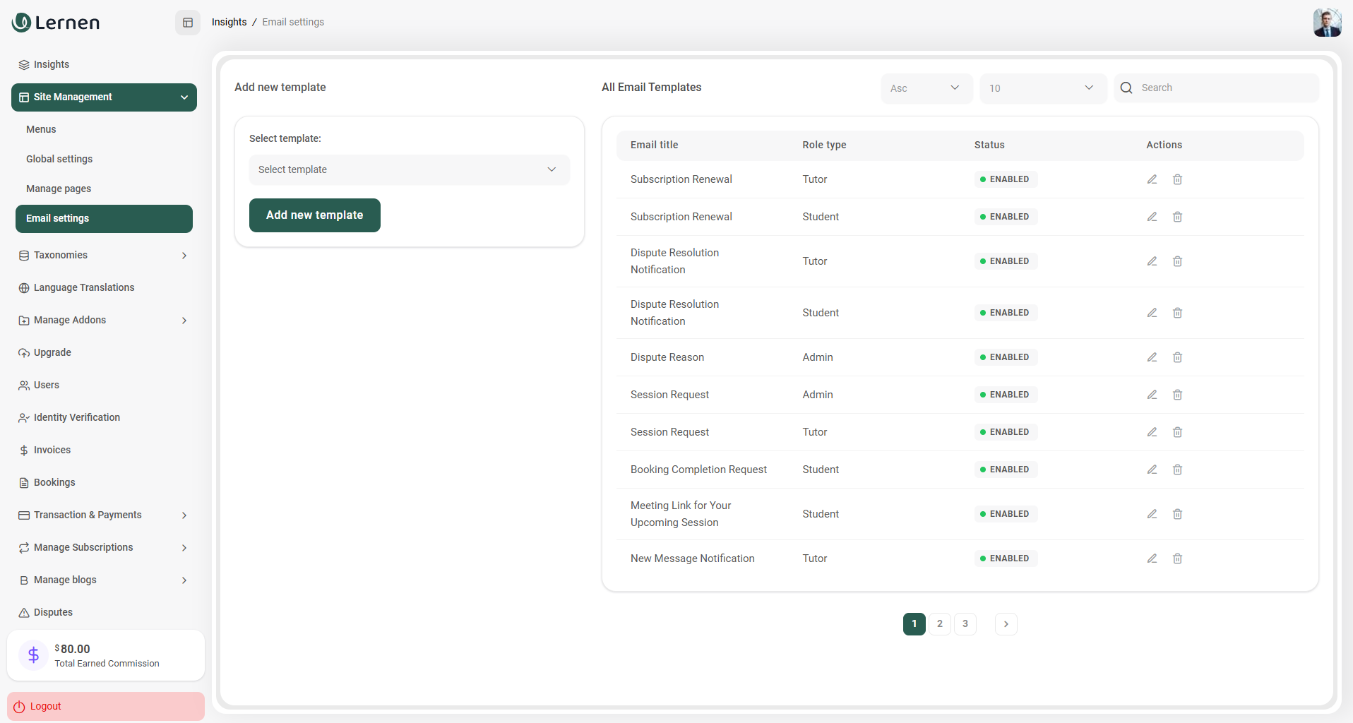 • Add New Template: Administrators can create new email templates by clicking on the Add new template button.