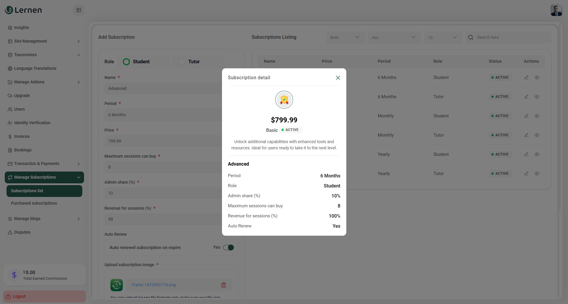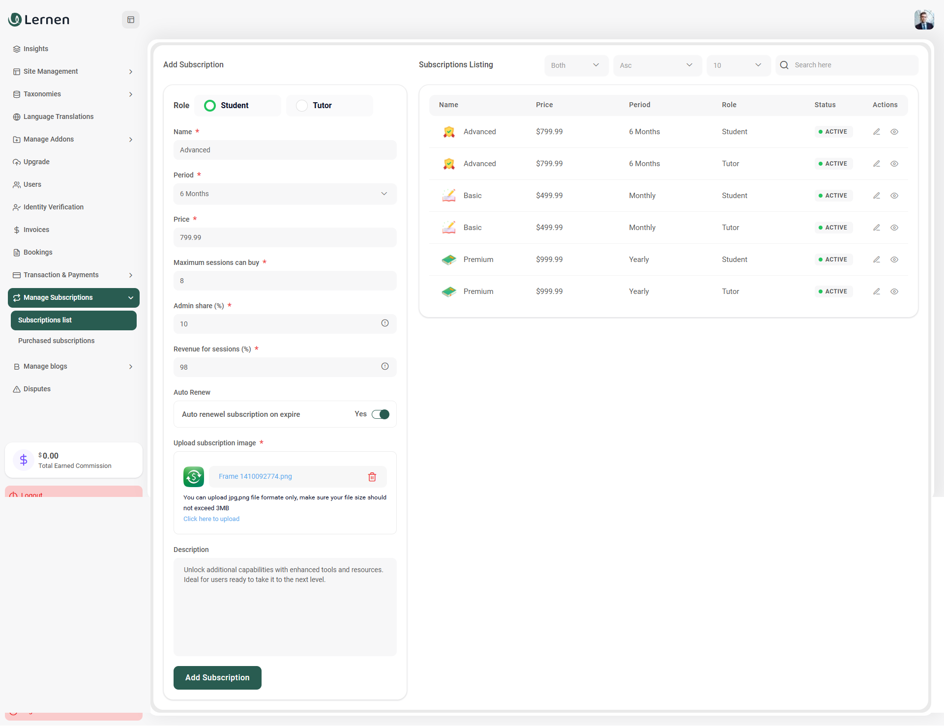 The Manage Subscriptions > Subscriptions List section provides a centralized view of all available subscription plans. It allows administrators to manage and oversee the details of plans for both students and tutors.
