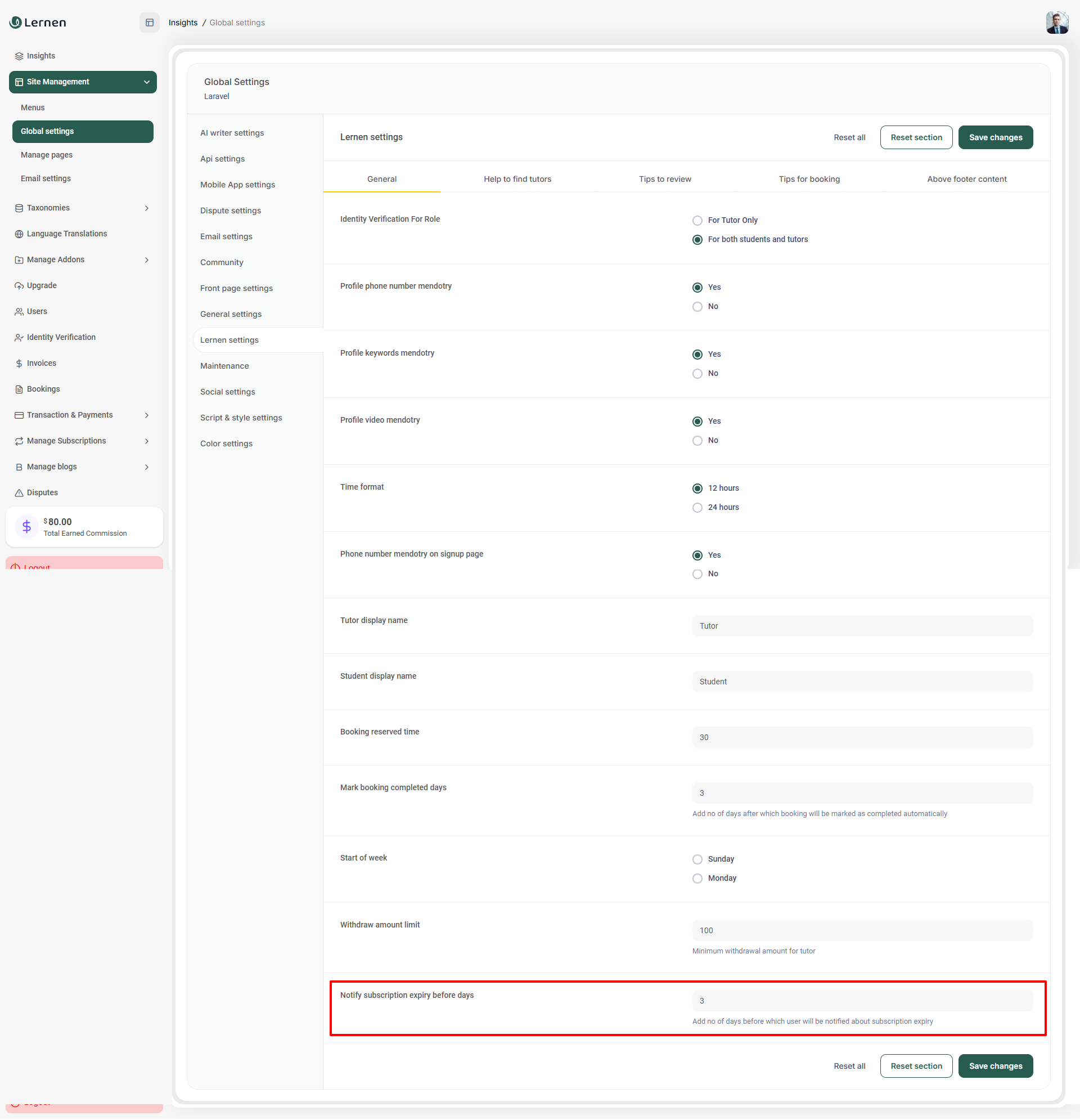• Navigate to Site Management > Global Settings > Lernen Settings.