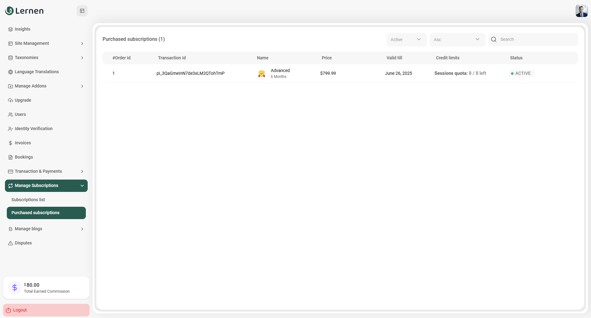 The Manage Subscriptions > Purchased Subscriptions section provides a detailed list of all subscriptions purchased by users on the platform. This area is essential for managing and tracking the subscriptions, their statuses, and their usage.