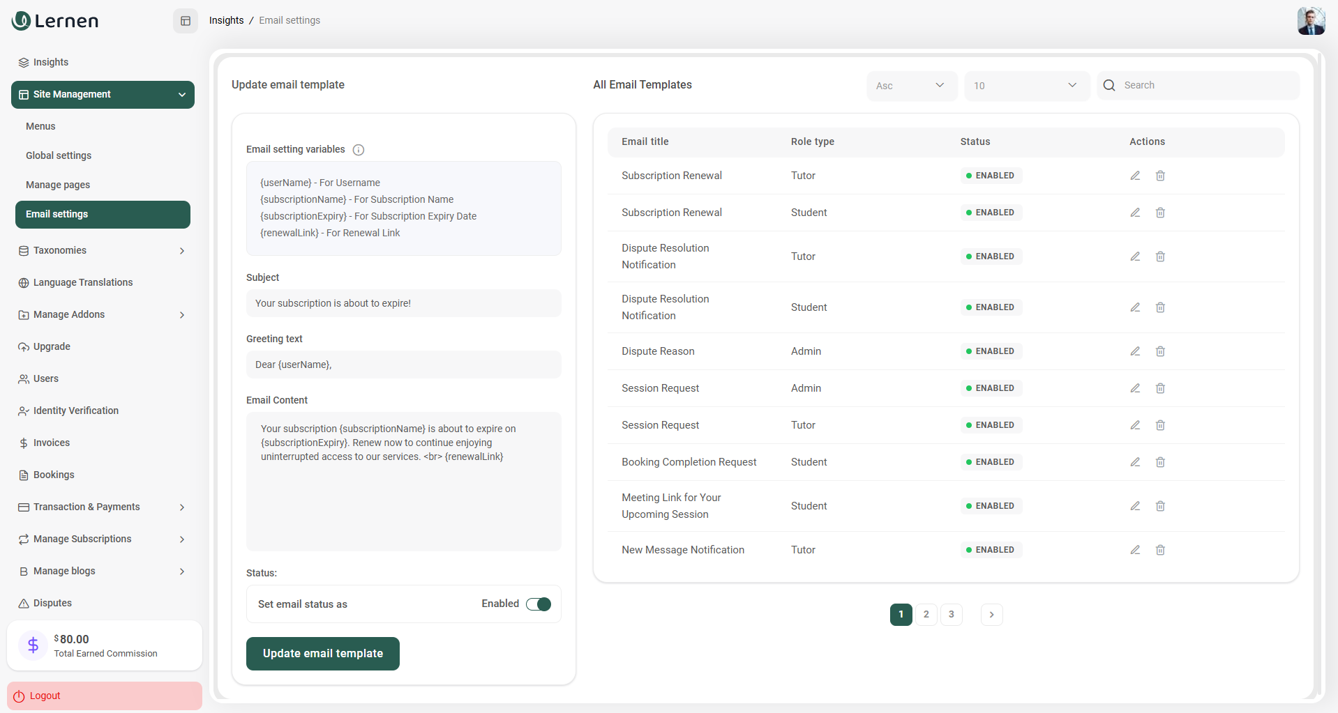 • Email Setting Variables Lists placeholders like {userName}, {subscriptionName}, and {renewalLink} that dynamically populate with specific data.