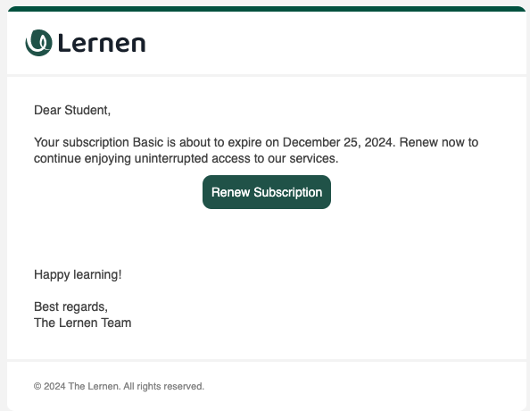 Email notification is used to notify the user about the subscription expiry and renewal. This email notification looks like this.