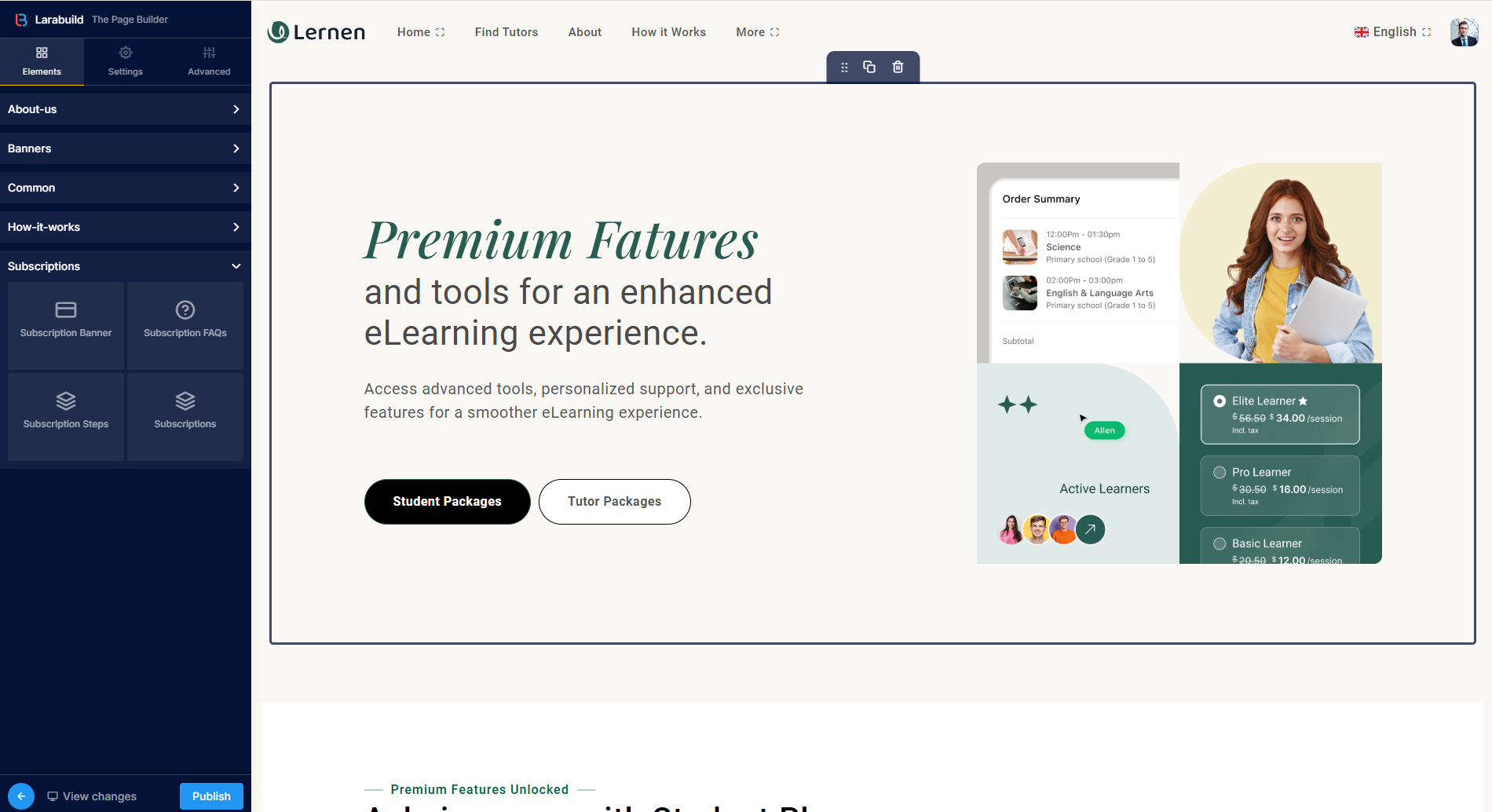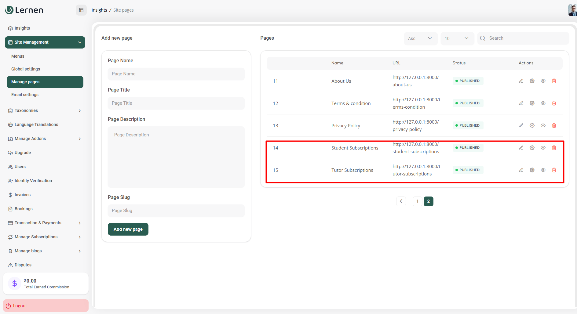 When a Subscription is created, associated pages for Tutor Subscriptions and Student Subscriptions are automatically generated. These pages allow administrators to customized and managed through the Edit, Settings, View, and Delete actions available in the Manage Pages section.