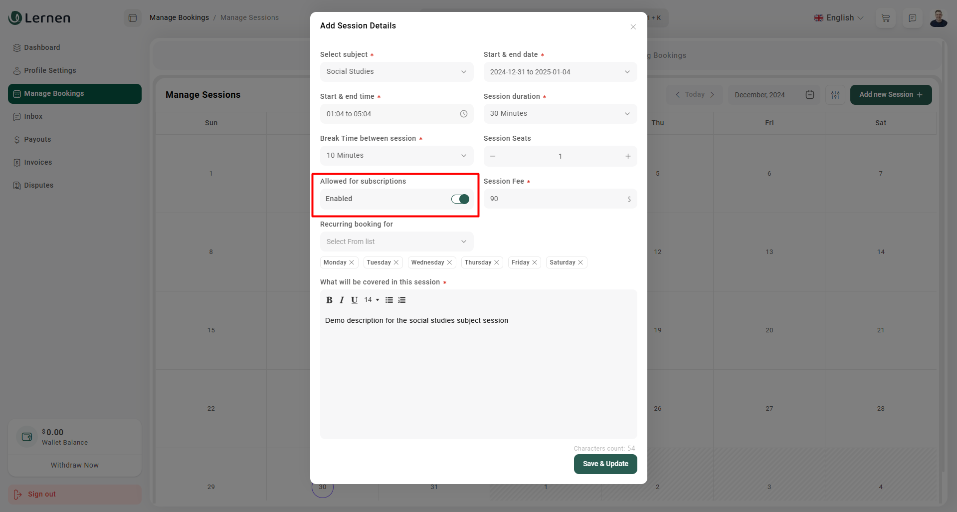 • Maximum sessions can buy: Numeric field to define the maximum number of sessions users can purchase under the subscription.