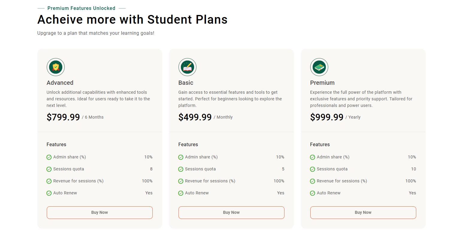 • If the selected session aligns with the student’s subscription plan, the process moves smoothly to the payment screen.