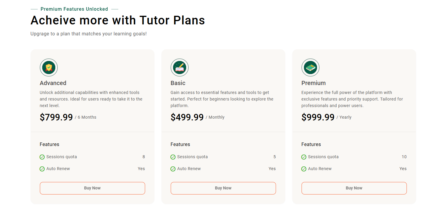 • You will be directed to a page displaying the available subscription plans for tutors.