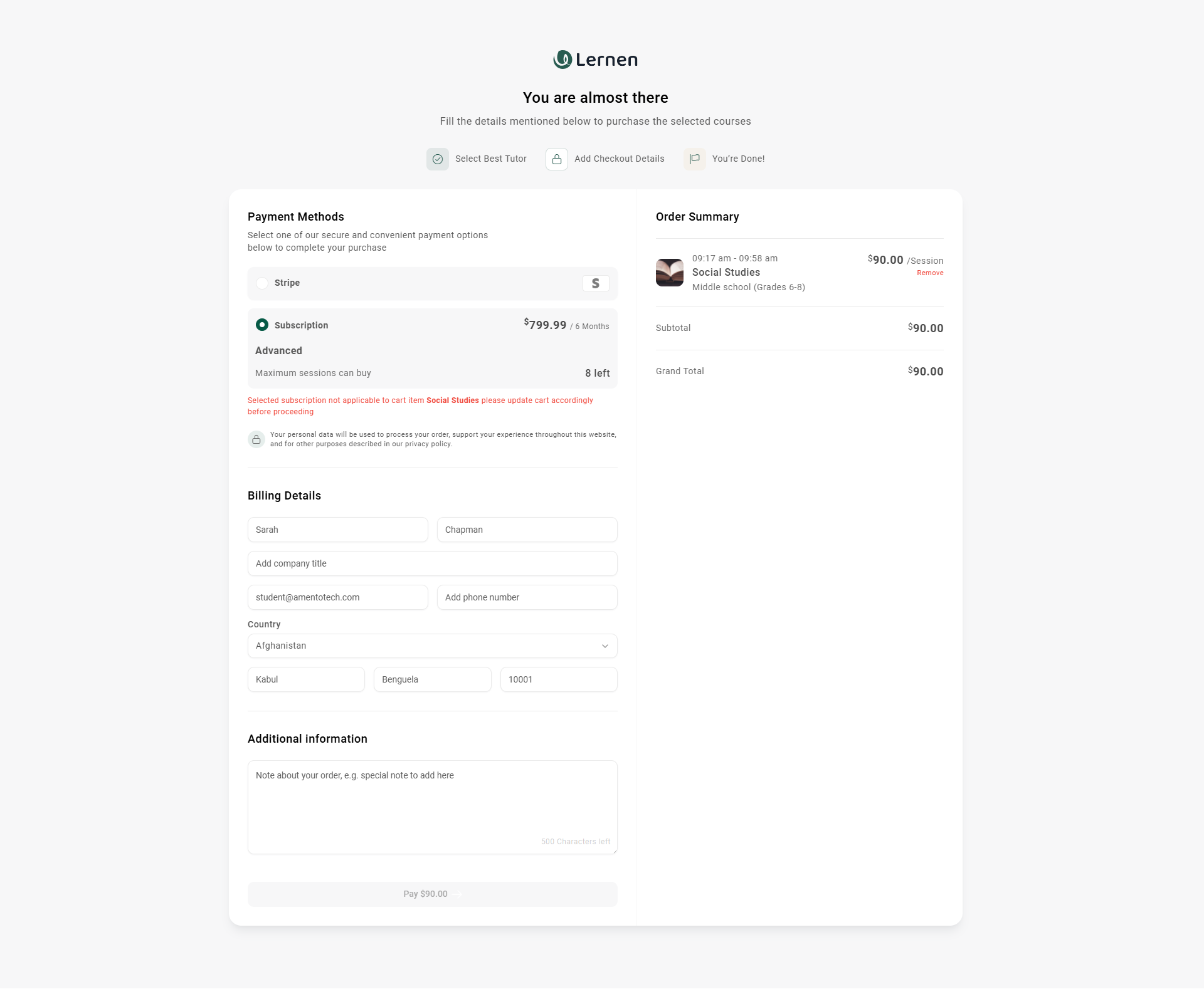 • If the tutor does not support the selected subscription plan, the system notifies the student during the checkout process.